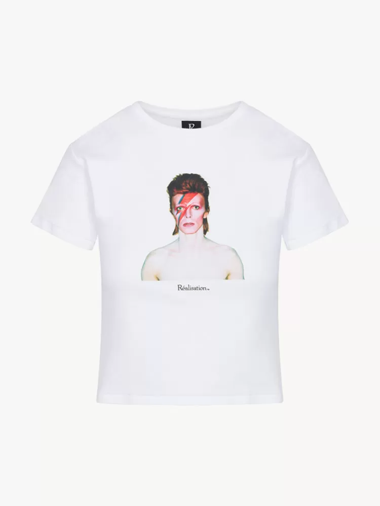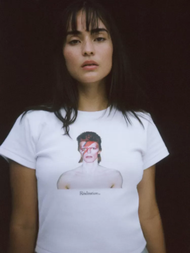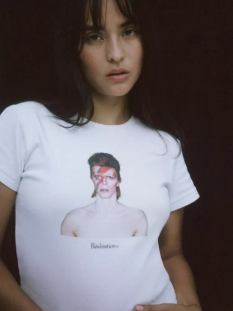 Bowie Forever In The Aladdin Sane Baby Tee. The Iconic Brian Duffy Lightning Bolt Image Shot In 1973 For The 6Th Album Of David Bowie’s – Aladdin Sane. The Jean Genie, Cracked Actor, Watch That Man – Wear All These Characters All At Once.