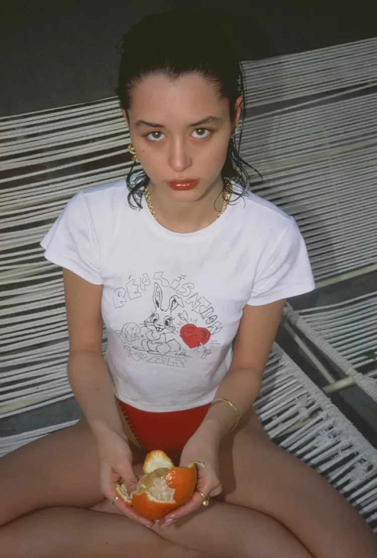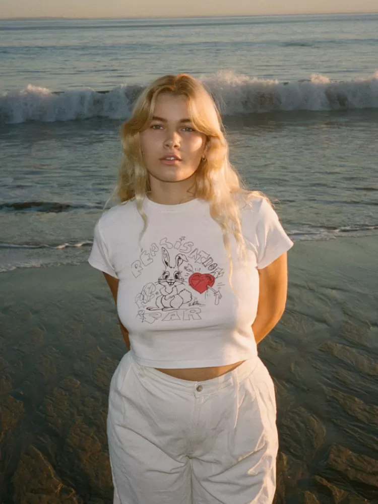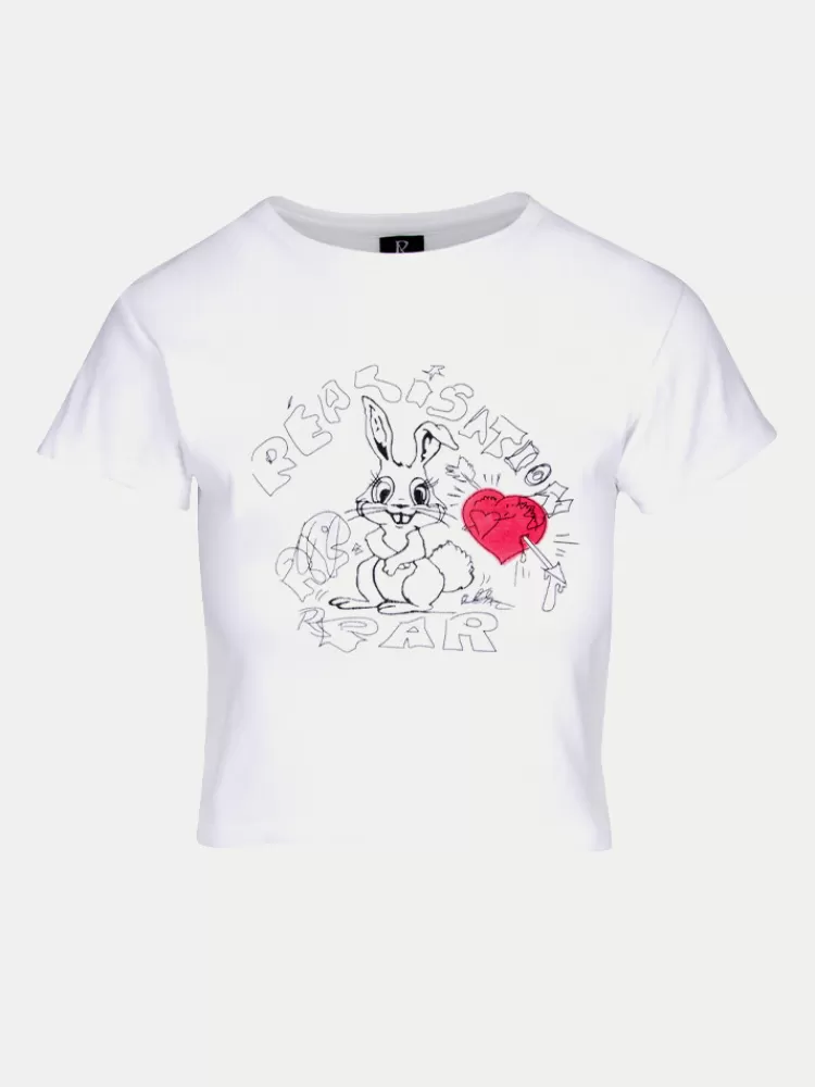 Whether Your Heart Is Red Or Blue Right Now, The Bunny Tee, With Graphic By Artist Zoe Vance, Is Here To Make You Feel Like That Inner Cute Honey Bunny That You Are. The Classic White Baby Tee Shape (You Know We Always Suggest To Size Down For The Perfect Tight Fit) With Black Illustration And A Splash Of Blue Or Red On The Heart. Our Perfect Addition To Your Real Baby Tee Collection.
