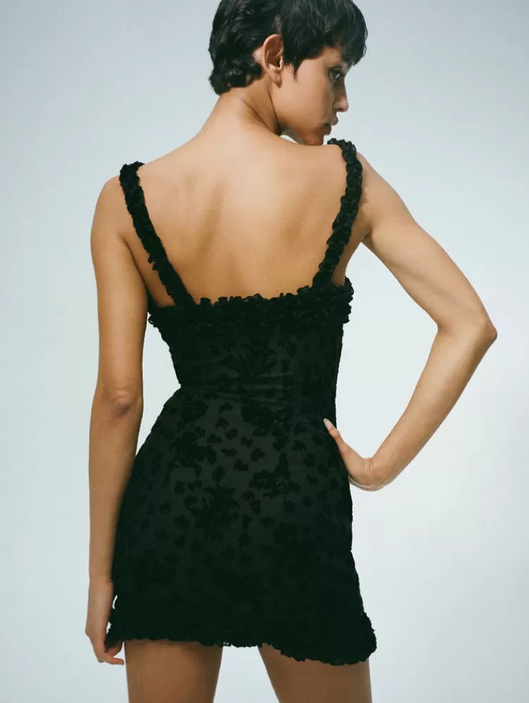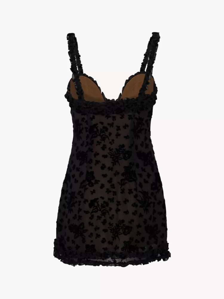 The Anouk Is Our Black Velvet Devore Floral Mini Dress With Frill Detail Around The Bust, Straps And Hem. She’s Lined To Give You Extra Coverage And Has A Side Zip To Nip You In Through The Waist. If You’Re A Fan Of The Original Julia Style, You’Re Going To Love This Dressed Up Mini. Ready To Salsa – Tick, Ready For Fun – Double Tick.