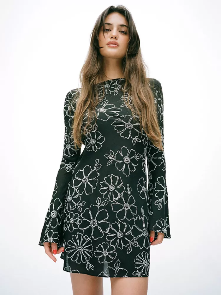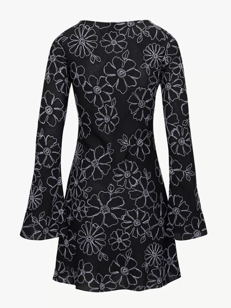 Bell Sleeves With A Flip In The Skirt Will Have You Feeling Like You’Ve Just Jumped Out Of A Jean-Luc Godard Movie. The Brigitte In Embroidered Fleur Is The Mini Dress That You Will Be Wearing On Summer Nights, And Autumn Days. A Black Silk Base With White Embroidery Feels Oh So Chic, The Perfect Throw On For Aperitivo Hour – Salut Mon Cheri, The Brigitte Is Here.