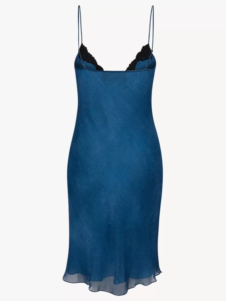 Looking For That Short Dress That Isn’T Too Short – Then The Daria Is For You. Taller Ladies, She’s Perfect For That Flattering Just Above Knee Length, The More Petite Dreamgirl, She Will Hit Just Below The Knees Making Her The Day To Night Dress You Need In Your Wardrobe. The Perfect Fresh Indigo Denim Printed Silk, Layered Over Pale Blue, Makes Her Opaque And The Perfect Day Dress. Black Contrast Lace Detailing Around The Bust And Adjustable Straps With A Body That Is Cut On The Bias, Will Have You Slipping Her On, Looking Fresh And Just A Little Sexy In The Most Understated Way.
