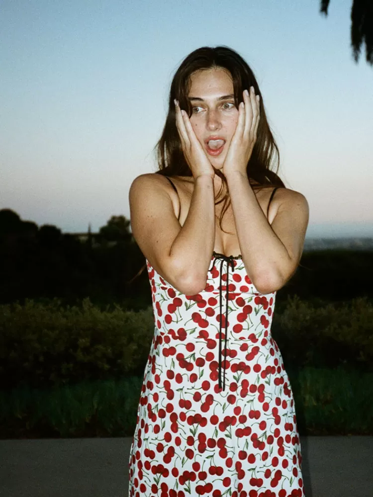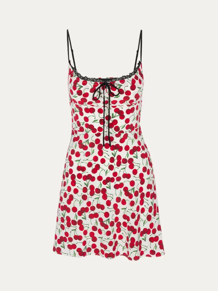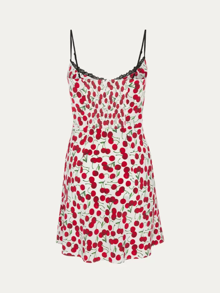 The Mini Dress In Cherry Print With A Little Peekaboo Black Lace On The Top Of The Bust – The Frank, She’s Fresh. A Milkmaid Style Top With Pull In Ties To Give You A Classic Decolletage. There’s No Need To Add Anything Extra To The Frank – You’Ll Be The Cherry On Top In This One.