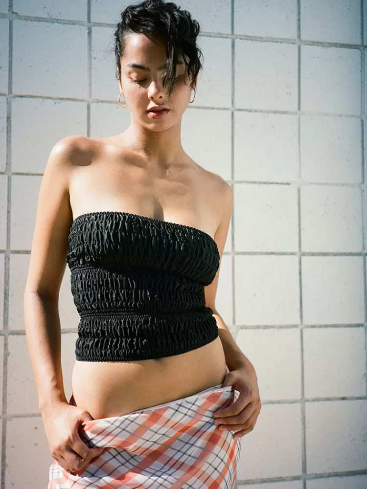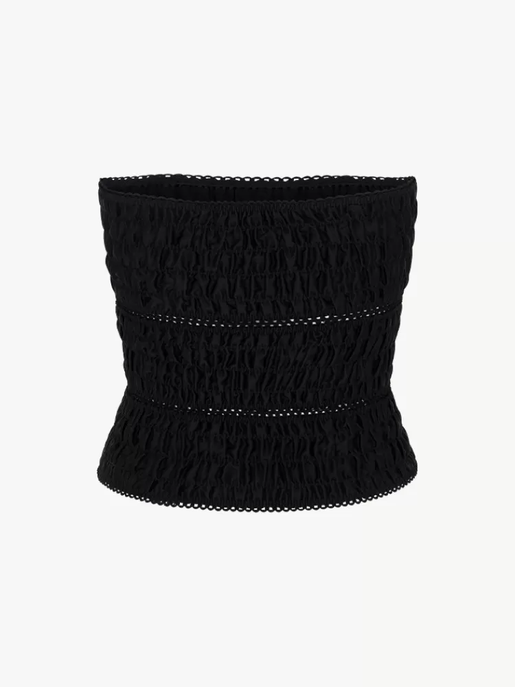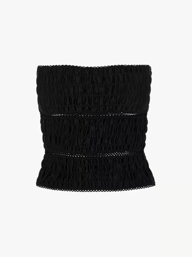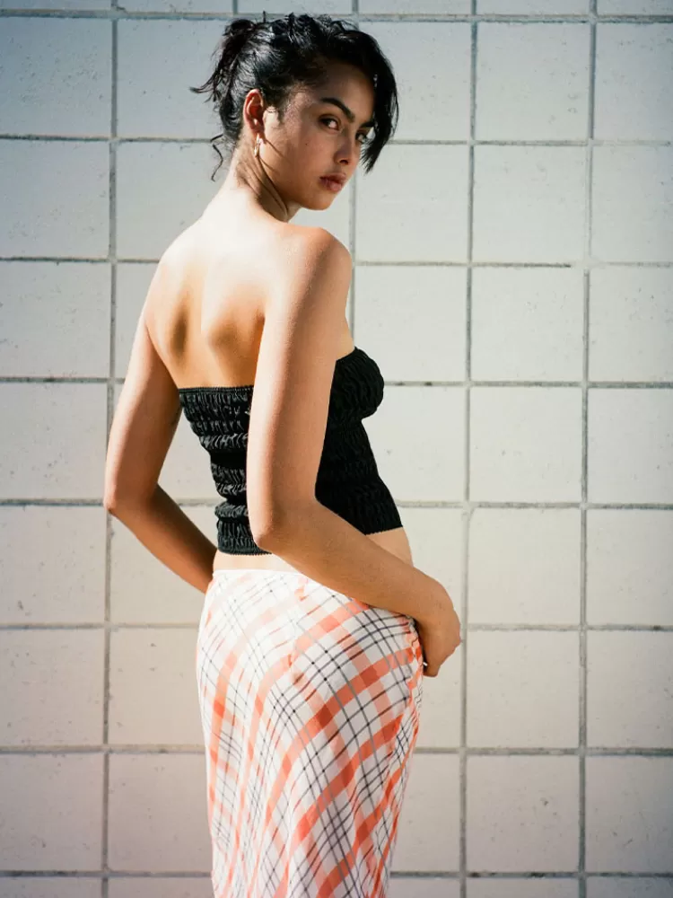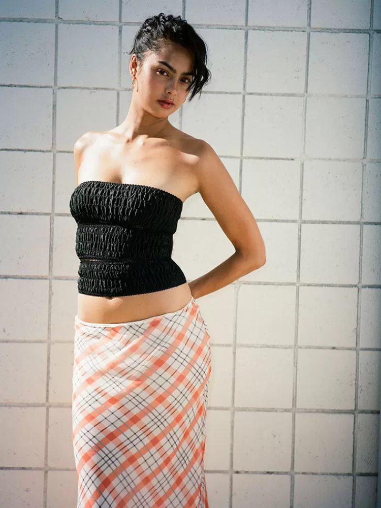 The Iman In Black Silk Satin Will Have You Feeling Elegant At Any Given Moment, Whether It’s Day Time Paired With The Bea In Summer Check Or A More Dressed Moment With The Gigi In Indigo. The Pull On Bandeau Style Top Is Panelled With Lacing Detail Between Each Section, Showing Off Just A Hint Of Skin When You Move. The Perfect Top To Wear With Any Of Your Real Skirts – Or For A Chic Monochrome Moment, Pull Her On With Some Crisp White Jeans And A Button Down Thrown Over The Top, Or One Of The Winona Cardigans. Shirred Silk Satin And Fully Lined In Silk Georgette She’s The Perfect Piece For Every Real Girls Wardrobe.