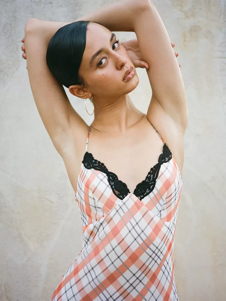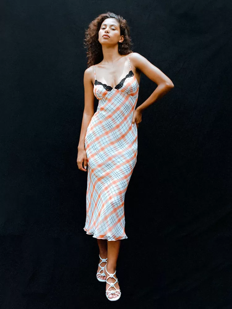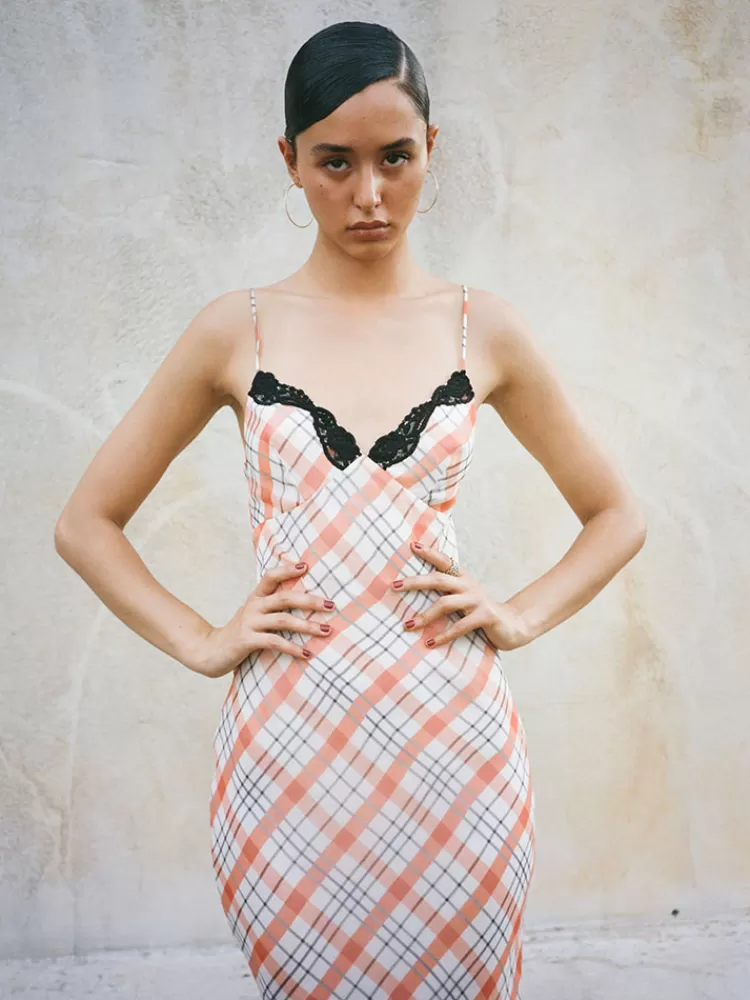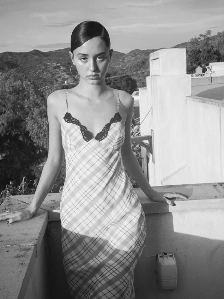 The Double Layered Karlie With Her Lace Detailing Around The Bust And Ankle Grazing Length, Is Going To Be Your Long Dress Of The Season. A Classic Take On The Negligee In A Printed Check Makes Her Wearable In The Most Chic Way. Slip Her Over Your Head As She Is Zipless, Pair With Your Mulholland Glasses And You’Re Going To Be Turning Heads – Whether That’s On An Amafli Holiday, At A Long Late Lunch In London Or In One Of Those New York Hot Summer Moments