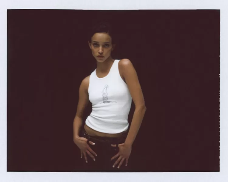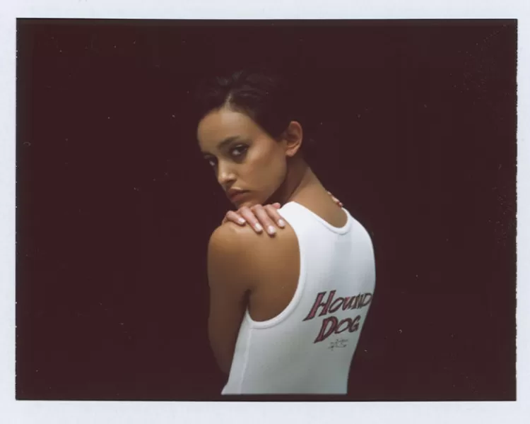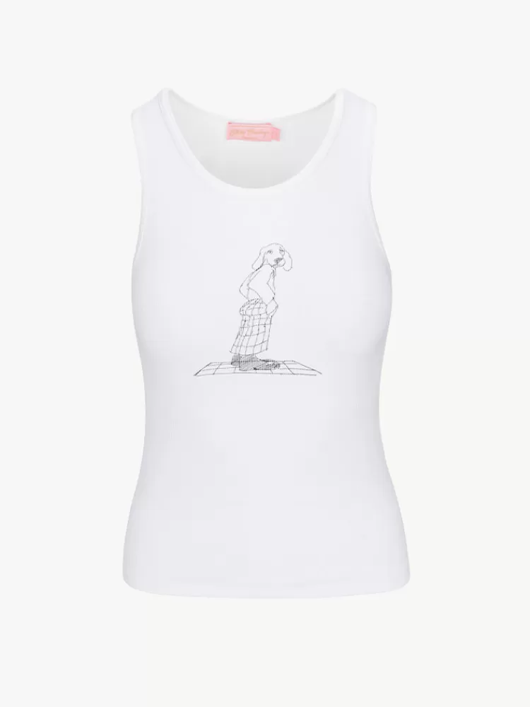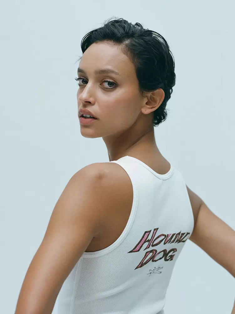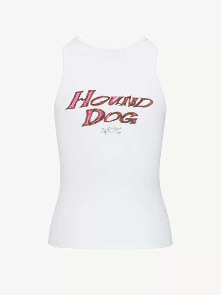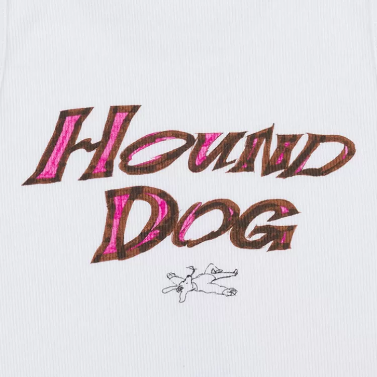 Taking Reference From Elvis In His Military Era – The White Ribbed Tank – An All American Classic. Hound Dog Illustrated By Artist Erik Solin, Features A Caricature Dog Front And The Slogan Hound Dog On The Back. The Perfect Edition To A Crisp All White Look, Or Perfect With Any Of The Limited Edition Skirts.