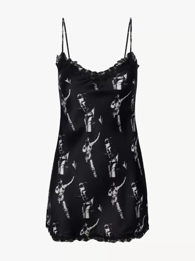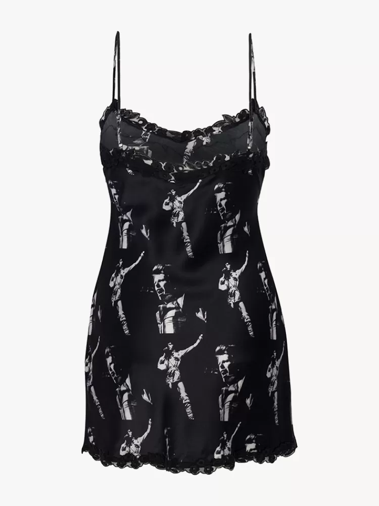 A Repeat Print That Is Splashed With Ziggy Stardust And Photographed By Masayoshi Sukita. The Sukita Slip Here To Take You Out Of The Stardust Dream And Into Bowie Reality. She’s Silk Satin And Mini In Length, Has Adjustable Straps And A Custom Lace Around The Neck And Hemlines.