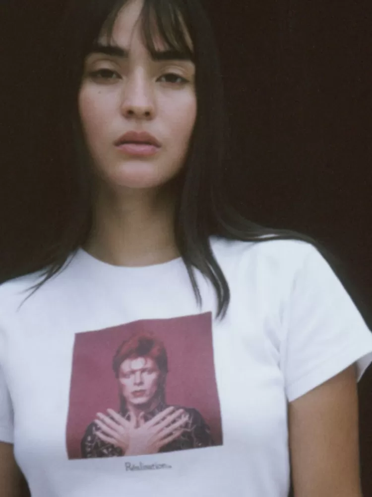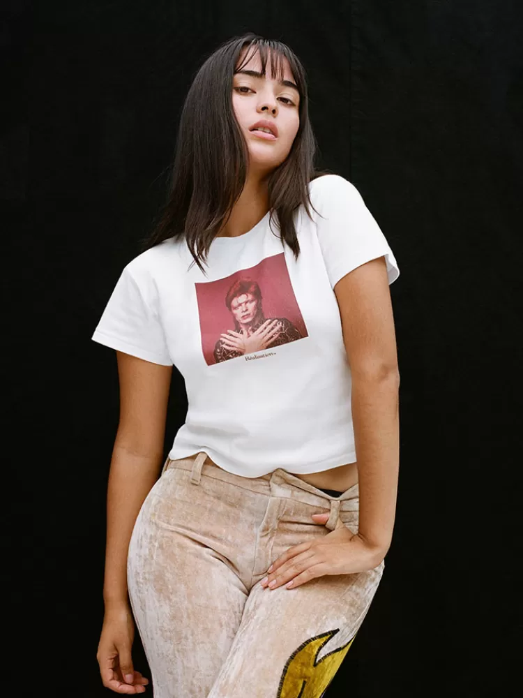 The Watch That Man Baby Tee With Photo By Masayoshi Sukita Is One Of The Seven Limited Edition David Bowie Tees To Collect. Bowie Dressed In A Kansai Yamamoto Costume, With Gold Glitter Nails And The Symbolic Gold Circle On His Forehead Is As Iconic As They Come.